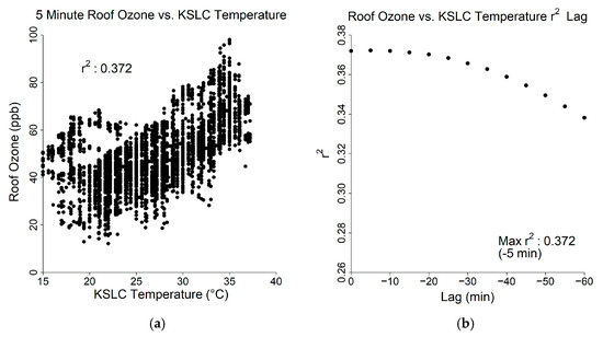 The Roof ozone and KSLC temperature were compared for the duration of the study period and are shown in Figure 7a. The KSLC temperature was used instead of the Roof temperature because of the 50 min lag in instrument temperature compared to the ambient (KSLC) temperature (Section 3.3). The r2 values obtained by lagging the Roof ozone readings to the KSLC temperature data are shown in Figure 7b. The maximum r2 was found to be 0.372 at −5 min, meaning that the temperature readings lagged the ozone values.