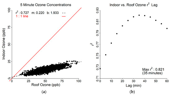 The Roof and indoor ozone levels were compared for the duration of the study period and are shown in Figure 8a. It is readily apparent that the indoor readings are only about 22% of the Roof concentrations. The r2 values obtained by lagging the indoor ozone readings to the Roof data are shown in Figure 8b. The maximum r2 was found to be 0.821 at 35 min. This pattern was also visible in Figure 4b and can be effectively understood to be the infiltration delay of outdoor ozone to the inside of the building.