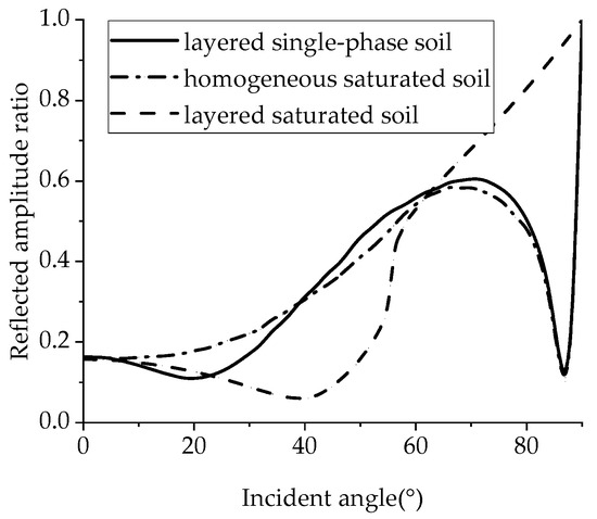 Figure 3 shows the contrast curve between the P1-wave reflection amplitude ratio and the incident angle of the fluid-saturated porous continuous barrier in stratified saturated soil and single-phase soil, where the barrier thickness is 2 m, the barrier porosity is 0.2, the upper saturated soil porosity is 0.18, and the lower saturated soil porosity is 0.30. This paper considers the frequency = 30 Hz, which is within the significant frequency range of the traffic environment vibration [4]. In the single-phase ground-based model, the reflection amplitude ratio of the P1-wave decreases with the increase in the incidence angle and reaches the minimum value near 21°. Then, it increases with the increase in the incidence angle and reaches a local maximum near 70°. When the incidence angle is from 70° to 87°, the reflection amplitude ratio of the P1-wave decreases rapidly with the increase in the incidence angle. It then increases rapidly as the incidence angle increases, reaching a maximum value of 1 at an incidence angle of 90°. In the layered saturated ground-based model, the reflection amplitude ratio of the P1-wave first decreases with the increase in the incidence angle, reaches the minimum value near 40°, then rapidly increases with the increase in the incidence angle and slowly increases, reaching the maximum value of 1 when the incidence angle is 90°. In the homogeneous saturated ground model, the reflection amplitude ratio of P1-wave increases with the increase in the incidence angle and reaches a local maximum near 70°. When the incidence angle is from 70° to 87°, the reflection amplitude ratio of the P1-wave decreases rapidly with the increase in the incidence angle. It then increases rapidly as the incidence angle increases, reaching a maximum value of 1 at an incidence angle of 90°. It can be seen from Figure 3 that the presence of fluid changes the trend of the reflection amplitude ratio with the incidence angle.