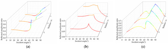 The change curves of the reflection amplitude ratios of the P1-, P2-, and SV-waves, incidence angle, and barrier thickness are shown in Figure 4, where the barrier thickness is 1 m, 2 m, and 5 m, respectively. From the perspective of energy conservation, the more reflection, the less transmission [11], and the energy transmitted by the P1-, P2-, and SV-waves to the upper saturated soil after passing through the fluid-saturated porous continuous barrier will be dissipated and attenuated. The amplitude ratio of the three reflected waves varies with the incidence angle, and the influence of the barrier thickness on the reflection amplitude ratio is discussed below. It can be seen from Figure 4 that the reflection curve is discontinuous, that there are two critical angles, and that the magnitude of the critical angles is closely related to the barrier thickness.