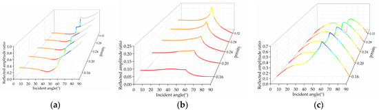 The change curves of the reflection amplitude ratio of the P1-, P2-, and SV-waves with the incidence angle and barrier porosity are shown in Figure 5, where the porosity is 0.16, 0.20, 0.24, 0.28, and 0.32, respectively.