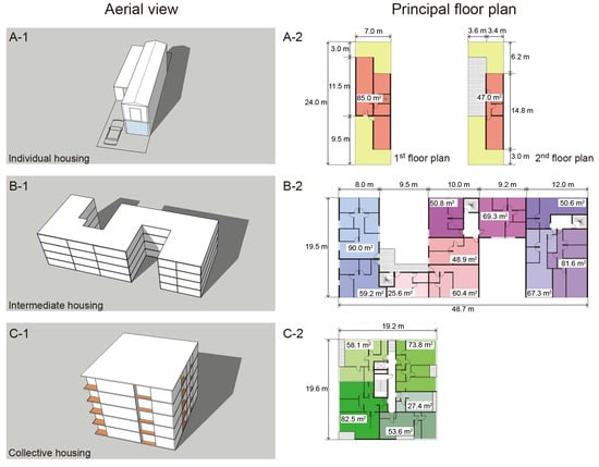 Three types of housing units. Aerial view and principal floor plan of each housing unit (source: designed by the author).