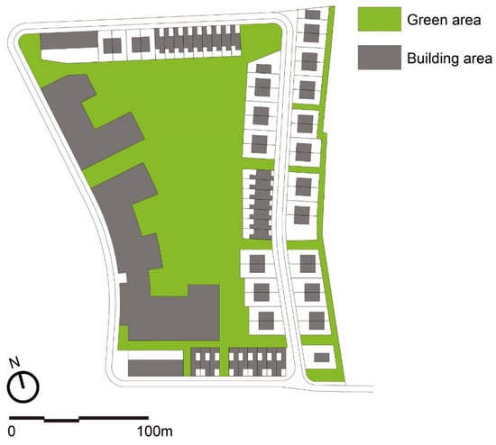 This study implemented a neighborhood plan to accommodate 234 households in the form of individual, intermediate, and collective housing at the Trémelière site in Le Rheu Commune. The main objective of the neighborhood design was to secure as much green space as possible at the center of the site to preserve the historicity of the Garden City—which was the basis of Le Rheu Commune’s urban planning—and to realize ecologically sustainable urban planning. Consequently, the total site area of 52,000 m2 was divided into a green area of 20,570.8 m2 and a building area of 13,955.3 m2 (Figure 8). The distribution of green and building areas indicated that the green area ratio within the site was 39.6%, and the building-to-land ratio was 26.8%. This result satisfied the urban planning regulations applied to this site, including securing a greenspace ratio of at least 30% and a building-to-land ratio of less than 30%.