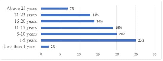 Figure 1 shows the respondents’ years of working experience. It comprises 2% (4) of respondents with less than one year of working experience, 25% (45) of respondents with 1–5 years of working experience, 20% (36) of respondents with 6–10 years of working experience, 19% (34) with 11–15 years of working experience, 14% (26) with 16–20 years of working experience, 13% (24) with 21–25 years of working experience and 7% (13) above 25 years of working experience from the 182 respondents who participated in the survey.