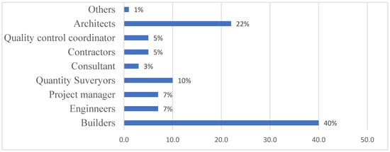 Figure 2 shows the respondents’ professional designation. It was revealed that builders were the most common profession with 40% (73), in second place was architects with 22% (40), and the third was quantity surveyors with 10% (18). It also involved 7% (13) project managers, 7% (13) engineers, 5% (9) quality control coordinators, 5% (9) contractors, 3% (5) consultants and 1% (2) others.