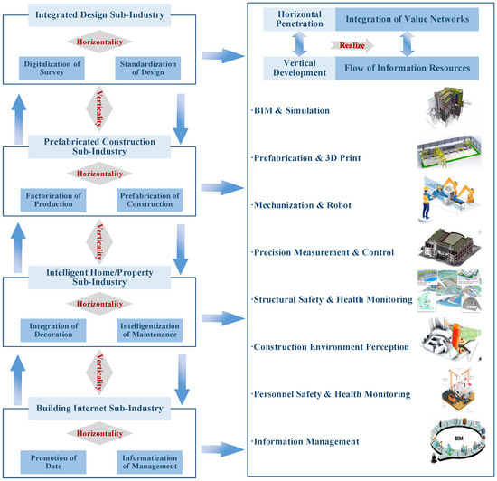 Based on the aforementioned analyses pertaining to the domain of intelligent construction, this paper defines the concept of the intelligent construction company that is the concern of this study. It refers to a construction and management company that utilizes advanced technologies and intelligent tools to digitize and automate the entire construction process [1,10,49]. Further, it narrows down to technological innovation. ICTI mainly involves horizontally integrating and vertically developing through the industrial chain to achieve dynamic breakthroughs in industrial technology modules [50]. HS realizes the integration of value networks within sub-industries [51], and VS enables the flow of information resources between sub-industries [52]. In short, it is necessary to organically combine the various interconnected technology modules to implement innovation, as depicted in Figure 1.