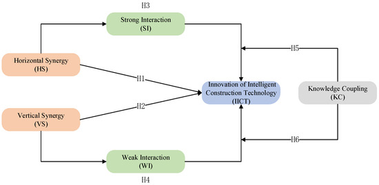 Compared to SI, WI is defined as an indirect process that influences the outcomes of technological innovation with low information redundancy, strong independence, minimal backflow, and few external constraints [77]. In VS, the diversity of agents and the comprehensiveness of relationships enable companies to identify potential synergistic partners and innovation opportunities for each agent through WI. This allows companies to explore uncharted territories, uncover more knowledge spillovers, generate cutting-edge technological solutions, and form in-depth developmental strategies. WI also expands the scale advantage of technological innovation and increases the likelihood of forming technological innovation alliances [71]. In the context of ICT, the intelligent construction industry’s collaboration alliance can continuously absorb upstream, midstream, and downstream industry companies to achieve the interactive synergy of ICT in scientific research, design, production, construction, testing, and operation activities within the construction engineering field. Based on these considerations, this study proposes the following hypothesis:
