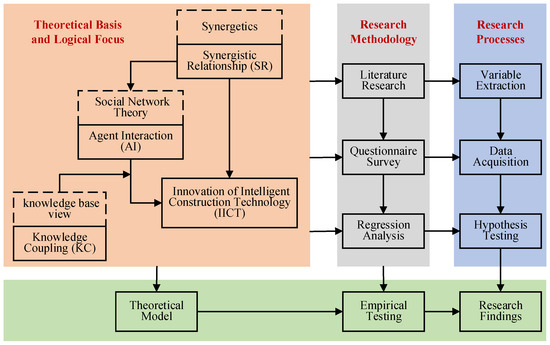 This study followed the logical framework of “characteristics-behaviors-results” in organizational behavior, integrated AI as a mediating factor to explore the impact of SR on the IICT, and considered the moderating role of KC to enhance the study. While existing studies demonstrate the effects of SR, AI, and KC on technological innovation, there remains a lack of consensus on their comprehensive roles, hindering a clear answer. Therefore, the main contributions of this study are as follows: (1) introducing the mediating variable of AI into the traditional SR study, classifying SR into horizontal synergy (HS) and vertical synergy (VS), and classifying AI into strong interaction (SI) and weak interaction (WI); this study compares and analyzes the different impacts of the two SRs on the IICT through the two states of AI to enrich the study on the impact of SR on IICT; (2) further introducing the moderating variable of KC and proposing a technological innovation analysis model based on “SR-AI-KC” to expand the research paradigm of technological innovation. The conclusions of the empirical study not only expand existing research results but also provide a new research perspective and analysis model for the field of technological innovation, offering a basis for intelligent construction-related companies to optimize the SR and manage the AI and KC effectively.