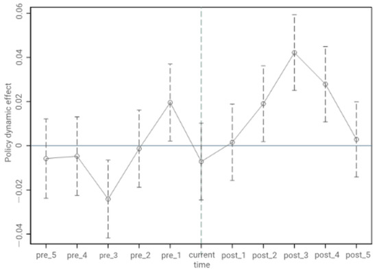 An essential premise for the quasi-natural experiment is that the experimental and control groups exhibit parallel trends before policy implementation. To ensure the robustness of the Double Difference Model (DID) conclusions, this study employs an event study method to evaluate parallel trends [31]: