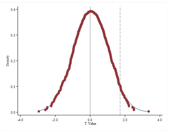 Initially, during the implementation of the smart city pilot construction policy, 20 cities were randomly selected from the data set as the treatment group and the rest as the control group. An interaction term (processing time) is constructed from this sample. Subsequently, this interaction term is included in the regression model. After repeating the above steps 500 times, the regression estimation coefficients are plotted as a kernel density map, as shown in Figure 2. The results show that the estimation coefficient is centered on zero and obeys normal distribution. In addition, most t values of the estimation coefficients exceed 0.1. This shows that the possibility that the baseline regression estimation results are influenced by unobservable factors is low, thus proving the robustness of the research results. Most scattered points in Figure 3 are located above the dotted line, that is, they are not significant at a level of 10% significance, which also illustrates the above research conclusions.