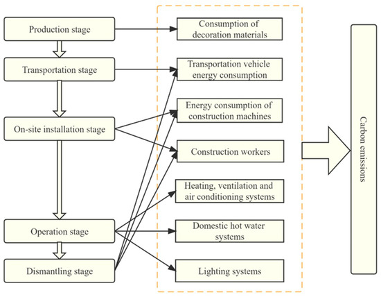 where is the total carbon emissions of the prefabricated decoration, is the carbon emissions in the production stage, is the carbon emissions in the transportation stage, is the carbon emissions in the on-site installation stage, is the carbon emissions in the operation stage, and is the carbon emissions in the dismantling stage.