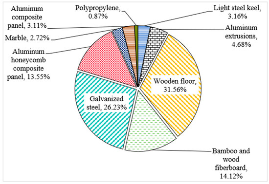 The main materials used in traditional decoration differ from the prefabricated decoration in terms of type and consumption, contributing to the different carbon emissions produced by the two types of decoration during the production stage. Figure 4 shows the percentage of carbon emissions generated by different material consumption during the production stage of the case study residential building using traditional decoration.