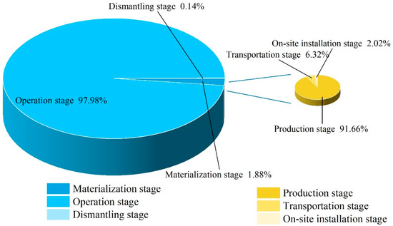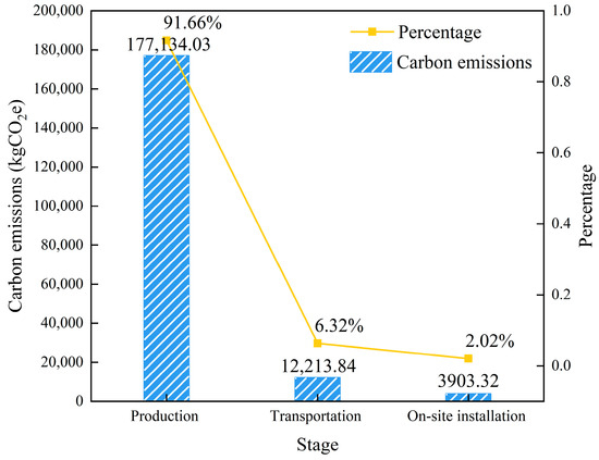 The carbon emissions distribution of the prefabricated decoration materialization stage can be derived from the carbon emissions calculation results of the production, transportation, and on-site installation stages, as shown in Figure 5.