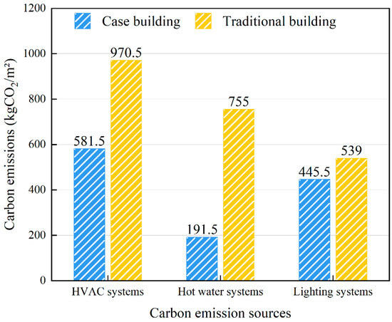 where is the carbon emissions from the operation of the HVAC system (kgCO2), is the carbon emissions from the operation of the domestic hot water system (kgCO2), and is the carbon emissions from the operation of the lighting system (kgCO2). The equations are as follows: