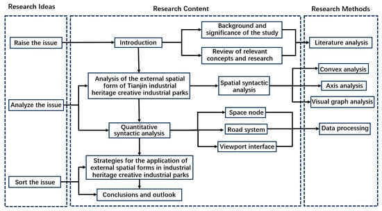 Spatial syntax has developed rapidly in recent years, and its use is gradually increasing as a method of quantifying space and enabling researchers to study spatial relationships in a more scientific manner. For example, spatial syntax is used to study the relationship between people and community space, the structures of streets over time, the influence of roads on urban structural connectivity, the tendency of visitors in choosing paths, the spatial visibilities of cities and the spatial relationship between cultures, settlements and the configurational structure of social spaces [,,,,,,]. Consequently, this study adopted spatial syntax as its primary methodology to investigate the spatial nodes, traffic routes and visual interfaces in the external spatial morphology of industrial heritage-based creative industrial parks in Tianjin.