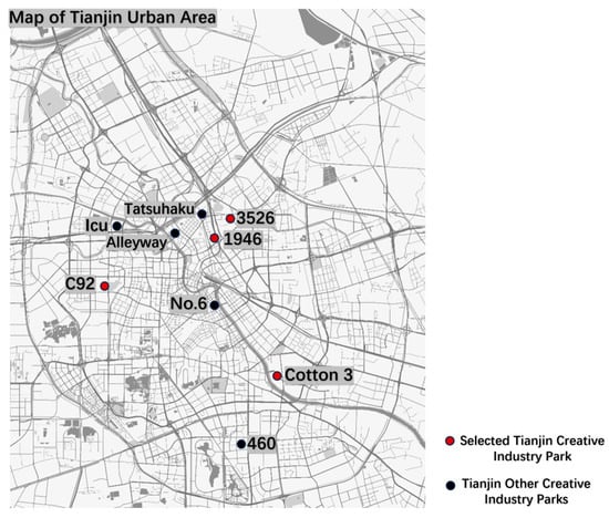 In terms of transformation time, the transformation times of Yiku Creative Industrial Park and Tatsuhaku Creative Industrial Park are relatively early, while the transformation times of other creative industrial parks are relatively late. In terms of the maturity of development, C92 Creative Cluster, No.6 Courtyard Creative Industrial Park, “1946” Creative Industrial Park and “3526” Creative Factory have higher grades of maturity and relatively better supporting facilities, while the other creative industrial parks have lower grades of maturity. In terms of scale, 460 International Design Park, Chenhe Creative Industry Park, Lane Warehouse Creative Industry Park and No.6 Courtyard Creative Industry Park are relatively small in scale; C92 Creative Cluster, “1946” Creative Industrial Park and Yiku Creative Industry Park are moderate in scale; and “3526” Creative Factory and Cotton 3 Creative Factory are relatively mature in development. In terms of geographical location, No. 6 Courtyard Creative Industry Park is the closest to the city center, 460 International Design Park is relatively far away from the city center, and other parks are at a moderate distance from the city center. After considering the above aspects, we selected four representative industrial heritage creative industry parks as the research objects of this study, namely, the “1946” Creative Industrial Park and “3526” Creative Factory in Hebei District, the C92 Creative Cluster in Nankai District and the Cotton 3 Creative Block in Hedong District (Figure 3). These four projects have higher grades of maturity, later transformation times, larger scales, moderate distances from the city center and located in different regions, and at the same time represent the development of creative industrial parks of the industrial heritage category in Tianjin from early stages to recent developments, which is more appropriate and scientific and suitable as the objects of this research.