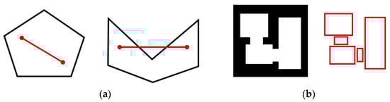 A straight line connecting any two points in a space is convex if it lies within that space. People within the same convex space can see each other and can communicate with each other to understand each other (Figure 5a). In covering a certain spatial system with a minimum and maximum number of convex spaces (Figure 5b), considering each convex space as a node and connecting them according to their relationship with each other, the system can be transformed into a spatial relationship graphic [].