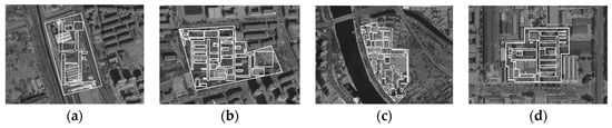 Since the visual field model is a horizontal profile study of the external space of the park, this study chose to investigate the visibility at the main elevation level of the creative industrial park. The outer contour maps of the buildings on the main elevation level of each park were drawn with a polyline in the Auto CAD software, and the building boundaries of the park were extracted. Finally, the park boundaries intercepted from the satellite map were imported into the Auto CAD software, and the overall area of the park was plotted with polylines to obtain the visual field models of the external spaces of the four parks (Figure 10).