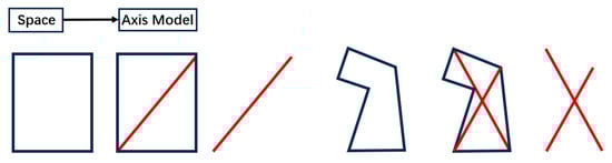 Axes represent the furthest distances visible from a point in space in the direction of the line of sight and are to be represented by the fewest and longest axes, representing the most convenient mode of movement (Figure 7). Each axis line is treated as a node in the operation of forming the relationship of the axial node intersection transformation in the spatial grouping to obtain a graphical relationship solution. Then, the axis model is calculated and analyzed using the spatial syntactic parameter variables, and different colored axes are obtained, representing different values [,].