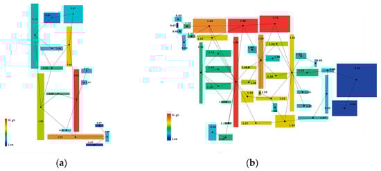 The integration degree indicates the degree of agglomeration or disaggregation of a unit’s node space with the remaining space in a spatial system. In an axial analysis diagram, the redder the color, the greater the integration degree of the node space, the better the accessibility of this node space and vice versa []. The formula of the integration degree Ii of node i is given in Equation (2):