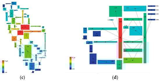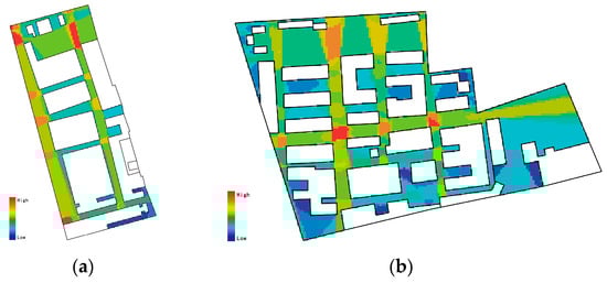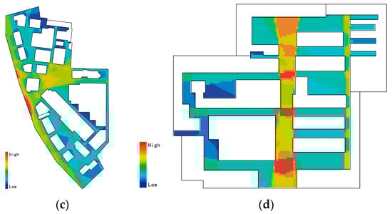 Spatial syntax can model and illustrate the relationship between the real external space of creative industrial parks, show the implicit logic and social attributes of the space through algorithms and thus explore the relationship between spatial structure and the activities of people using the park [,]. With the help of spatial syntax software Depth Map(0.8.0.) to analyze the data can help us visualize the external spatial relationship of industrial heritage creative industrial parks and analyze the problems according to the data obtained, so as to provide targeted optimization suggestions (Figure 4).