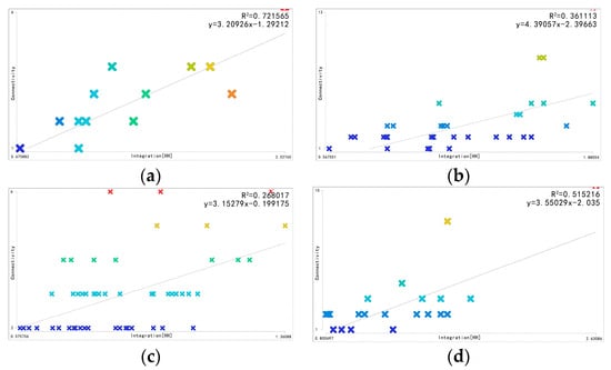 The convex intelligibility R2 of the external space system of “3526” Creative Factory is 0.361, which is less than 0.5, indicating that the overall intelligibility of the space nodes in the external space system of the park is limited, and it is difficult to judge and grasp the distribution of the overall external space nodes of the park through the local space nodes. After the research, we found that there are a high number of external spatial nodes within the park. Aside from the spatial nodes divided into roads, the other plazas, greening and other functional spatial nodes in the park are relatively dispersed, and their locations are relatively remote and hidden. These nodes are infrequently used or recognized, thereby complicating the process for individuals to accurately locate and understand the park’s comprehensive external spatial node arrangement. The R² value of convex intelligibility in the external space system of Cotton Three Creative Block is 0.268 (<0.5), indicating that the overall intelligibility of the space nodes in the external space system of the park is relatively low, and it is difficult to grasp and judge the distribution of the overall external space nodes of the park in a complete way. Subsequent research and analysis indicate that the park encompasses a considerable area with numerous spatial nodes. While the location of key spatial nodes in the park can be identified and judged with relative clarity, the identification and cognition of the park’s entire external spatial node structure is considerably more challenging, reflecting a lower degree of intelligibility.