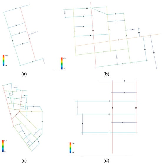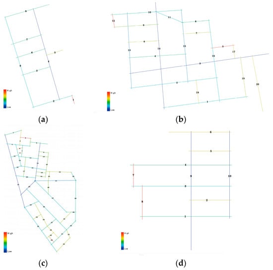 In order to ensure the accuracy of the quantification process, the scope of the study was expanded to the park’s carriageway roads, pedestrian roads and some of the pedestrian paths with high penetration found by the research, and curved paths were converted with clearer guidance into straight paths according to the calculation principle of the Depth Map software. Figure 8 shows the axial models of the road systems of the four creative industrial parks drawn in Auto CAD.