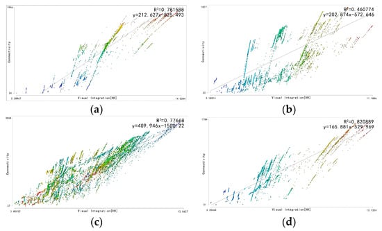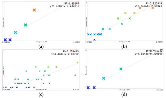 Intelligibility calculates the correlation coefficient between connectivity and integration, indicating the spatial characteristics of the whole system as perceived through local features. The closer the correlation coefficient (R2) is to 1.0, the higher level of intelligibility. A spatial system with a high degree of intelligibility should have good connectivity between local and neighboring spaces within the system and a high degree of integration of the system as a whole, so that the structure of this spatial system is clearer and easier to be understood by visitors [,,]. The intelligibility calculation formula is given in Equation (3):