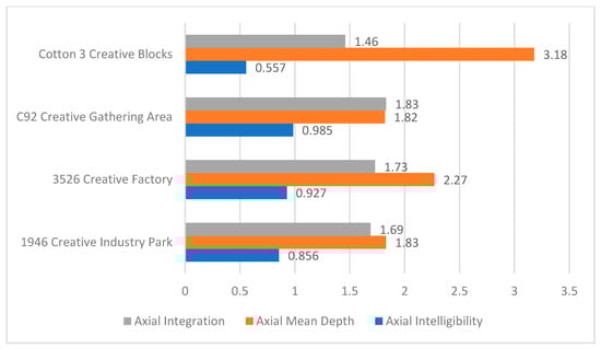 Axis integration analysis chart: (a) “1946” Creative Industrial Park; (b) “3526” Creative Factory; (c) Cotton 3 Creative Block; (d) C92 Creative Cluster.