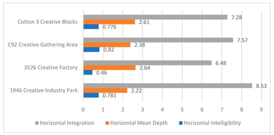 Figure 22 illustrates a comparison and analysis of the average values of visual domain integration, as derived from the syntactic quantification of the external spatial interfaces of the four parks. The results indicate that the values across the parks are relatively high and show minimal variance. Notably, the “1946” Creative Industrial Park exhibits the highest value, indicating that its external space area possesses the strongest visual convergence ability among the four parks. This facilitates an efficient dispersion and guidance of crowds. The C92 Creative Cluster and the Cotton 3 Creative Block follow closely, with little difference between them and an overall average level of visual integration. In contrast, the “3526” Creative Factory registers the lowest value, suggesting a comparatively weaker capability in its external space to converge sightlines, which negatively impacts the direction and distribution of crowds. The research identified that in the “3526” Creative Factory, areas with cold colors have fewer landscape facilities, leading to poor spatial identifiability. This lack of distinct features makes these areas less accessible and results in a lower degree of visual integration.