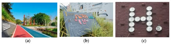 (1) Enhancement of the Walking and Signage Guidance Systems: The road network in the creative industry park serves a dual purpose, accommodating both vehicle traffic and pedestrian movement. A well-developed pedestrian system directly affects people’s activities in the external space of the park and plays an important role in shaping the vitality of the external space of the creative industry park. It is recommended to set up a pedestrian road that connects different buildings and landscape spaces in the park and adopt different pavement materials for spaces with different functional attributes to improve the comfort of walking (Figure 24a). The design of the signage and guidance system in the external space of the industrial creative industrial park will directly affect the feelings of park visitors. These designs should be concise, clear and intuitive. As far as possible, the guidelines of the park plan and the locations and functions of buildings should be introduced in detail to improve the sense of fluency when people walk (Figure 24b). The C92 Creative Cluster, which has the highest degree of integration in the central axis of the text, adopts a dial as an elemental symbol in the design of its signage and guiding facilities, and expresses it in the form of an arrangement of compositions, which perfectly show the history and culture represented by the predecessor of the park, Tianjin Instrumentation Factory, with a great sense of creativity (Figure 24c).
