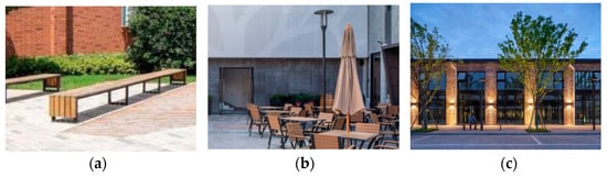 (4) Enhancing Service Facilities in the External Spaces: The addition of user-friendly public service facilities, such as directional signs, bins and charging facilities in the external spaces, which can enhance the overall image and quality of the park, increase the sense of identity and belonging for visitors, and in this way, also increase the spatial abundance and elevate the convex integration degree of the corresponding renovated spaces in the parks. In the processes of renewal and reconstruction, the parks should improve infrastructure in the external spaces and add facilities for visitors to rest, such as steps, planting pools and rest seats (Figure 27a). Moreover, the consideration of local climatic conditions is essential, necessitating the installation of amenities offering sunshade, windbreaks and rain protection (Figure 27b). Additionally, the placement of aesthetically pleasing and artistically designed lighting fixtures (Figure 27c) will provide essential night-time illumination for park pathways, ensuring safety during nocturnal activities and contributing to the park’s visual appeal. At the same time, more public restrooms should be installed to facilitate people’s outdoor activities.