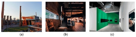 (5) Enhancing the Industrial Cultural Atmosphere of the Park: The park’s historical context often includes numerous abandoned factories, warehouses, railway tracks, pipelines, chimneys and industrial equipment, such as components of production machinery, which are the original codes and symbols of the factory, that offer insights into its historical lineage and embody the industrial culture. During the park’s renewal and reconstruction, these wastes should be preserved and fully utilized as far as possible. One of the ways of doing so is to give these wastes to artists for transformation and processing, so that they can become new landscape elements of the park and further improve the overall industrial cultural atmosphere of the park, so as to improve the mean depth of the visual field. Beijing 798 Art District preserves the original structure, form and skin of the insides of the factory buildings in the processes of renewal and reconstruction, fully refining and displaying the unique style of the old industrial buildings. It is also possible to give new functions to the external space through processing techniques such as addition, demolition and replacement, so that the original factory building can be fully utilized (Figure 28a). The Chongqing Aile Factory made a staircase addition to the top space of the factory building and retained the industrial heritage equipment, thus displacing the function of the space and making it an interesting place for activities, which attracted many music lovers to visit (Figure 28b). Shanghai M50 Creative Park often organizes exhibitions and activities in the form of cultural and art festivals, showcasing distinctive cultural activities and cultural works and engaging visitors, thus bringing more vitality to the park (Figure 28c).