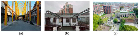 (6) Enhancing the Openness and Visibility of the External Space: The spatial openness and visibility are affected by the spatial enclosure. When surrounded by enclosing solid walls, the user’s line of sight is restricted, and it is difficult to produce visual contact with the outside world, which in turn hinders possible interaction activities from the side and is contrary to the original intention of seeking openness and communication. Therefore, in order to enhance openness and visibility, we should adjust the virtual and real designs of the enclosing interfaces, height differences and plane layouts to make them sight-penetrable. In the “1946” Creative Industrial Park, which has the highest degree of visual integration, partial walls have been removed and replaced with fences to enhance accessibility and openness. This modification in the enclosure style of the entrance area has significantly strengthened the communication atmosphere (Figure 29a). At the same time, the openness of the space is also directly related to the scale of the space, which affects the psychology and behavior of the users, and a relatively narrow or closed space makes people unwilling to stay for a long time. At the same time, it is also important not to over-pursue the openness of a space and set up a space with too large a height-to-width ratio, which will reduce the sense of security and interest of the space. In addition, roof decks can be used to increase spatial openness; for example, the E warehouse creative industrial park in Shanghai (Figure 29b) and the PAKT Block in Antwerp, Belgium (Figure 29c) both use roof decks to enhance spatial openness.