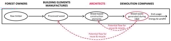 Architects specify construction materials: wood elements generated during the demolition phase and often categorized as wood waste have the potential to be reused and recycled as wood-based construction elements or returned to wood processing and reused/built in a new construction.