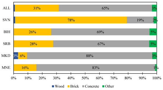 The building sector in Slovenia, Serbia, North Macedonia, BiH, and Montenegro varies based on each country’s economic, social, and cultural context. Several factors, such as the forest area and forest utilization rate, dominate the timber production and market both in individual countries and globally. Slovenia has a well-developed and sustainable building sector, while Serbia is only at the beginning of the path to introduce and implement more comprehensive sustainability- and circularity-related principles, following the introduction of a set of laws and regulations to improve the energy efficiency of buildings. North Macedonia is rebuilding its sector after political and economic instability, and BiH [] has a mix of traditional and modern practices focusing on sustainability. Montenegro’s sector has experienced significant growth, driven by tourism and foreign investment, yet persistent challenges such as transparency issues remain. Some basic key figures for all five countries are shown in Table 1.
