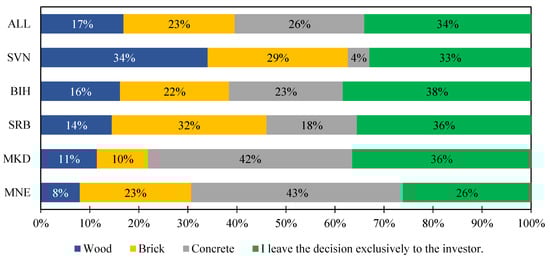 Architects believe that investors most often choose concrete as a building material. However, there are significant differences between countries (χ2(12) = 145.521, p < 0.001) (Figure 2). In more than 30% of cases, the architects leave the decision about the building material exclusively to the investors. Recommendations on building materials also differ significantly between countries (χ2(12) = 71.565, p < 0.001) (Figure 3). In North Macedonia (88%) and Montenegro (83%), architects most often recommend concrete to investors (42% and 43%, respectively), and investors use concrete 88% and 83% of the time, respectively. In Serbia, architects most often recommend brick (32%), followed by concrete and wood. In BiH, architects recommend concrete (23%) or brick (22%) and, to a slightly lesser extent, wood (16%). In both countries, most investors use concrete (69% in BiH and 67% in Serbia), followed by brick, while 5% use other materials such as steel, glass, or stone. Slovenia stands out the most; it is the only country where architects mostly recommend wood as a building material (34%), followed by brick (29%) and, very rarely, concrete (4%), which is in alignment with new Slovenian building regulations. Investors, on the other hand, most often choose brick (78%). The survey showed that wood is very rarely chosen as a building material in all countries studied here.