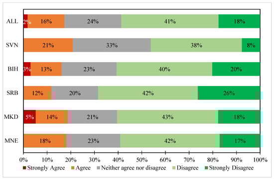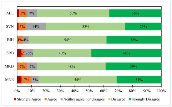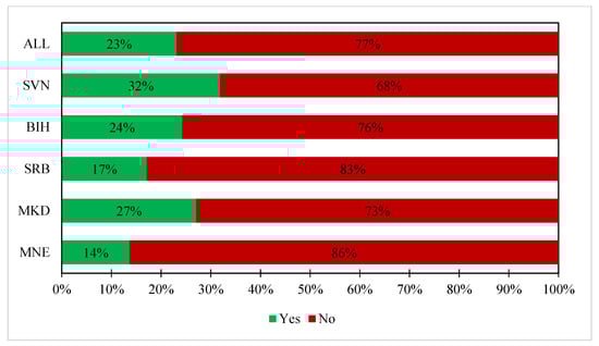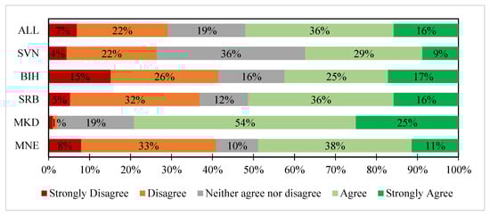 The statistical software JASP 0.16.4 was used for data analysis. The statistical significance level was set at p < 0.05. Descriptive statistics such as frequency counts and percentages were obtained and presented in bar graphs. Pearson’s chi-squared test for cross-tabulations was used to assess differences between countries and groups of respondents. Spearman’s rank correlation coefficient, a nonparametric measure of dependence, was used to measure the correlation between two ordinal variables. The following abbreviations have been used in all charts: ALL—the data for all five countries combined, SVN—Slovenia, BIH—Bosnia and Herzegovina, SRB—Serbia, MKD—North Macedonia, MNE—Montenegro.