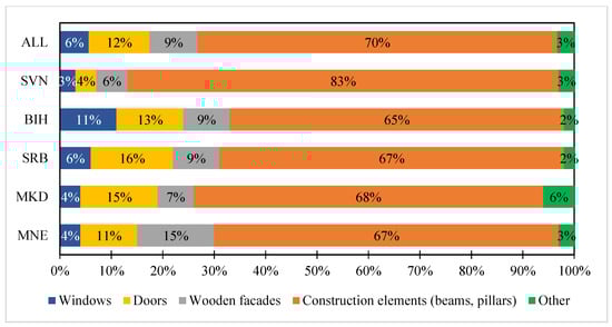 Only a small minority of respondents, ranging from 4% to 10%, agreed or strongly agreed with the statement that wood elements used in construction are made for single use and cannot be recycled, while 80% to 92% of respondents disagreed or strongly disagreed with this statement (Figure 6). There were statistically significant differences among countries (χ2(16) = 28.381, p = 0.028). The highest percentage of undecided respondents was found in Slovenia (14%). Most of the respondents considered construction elements like beams and pillars to be the wood products with the highest reuse potential (Figure 7). The percentage varied from 65% in BiH to 83% in Slovenia, but the differences were not significant.