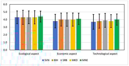 The average scores and standard deviations of the importance of the ecological, economic, and technological aspects (Q: How important are the following aspects when reusing wood products?).