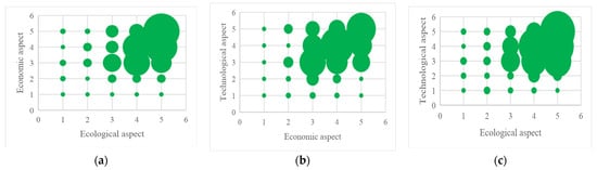Correlation between the importance of the ecological and the economic aspects (a), the economic and technological aspects (b), and the ecological and technological aspects (c).