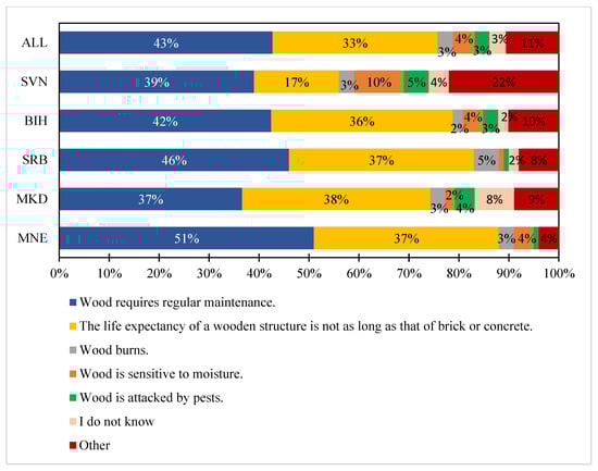 Doubts about the long-term quality of wood products can arise due to several factors. While wood is a popular and versatile material, it is not immune to potential issues that can impact its long-term performance. There are several reasons that discourage investors from choosing a wooden house. The most important for the respondents was the need for regular maintenance of wood and the shorter life expectancy of a wooden structure compared to that of brick or concrete (Figure 10). The differences among countries were significant (χ2(24) = 56.501, p < 0.001). In Slovenia, 39% of respondents cited regular maintenance as the most important reason, followed by other reasons (22%): fire risk—wood is considered to be a combustible material; certain pests, insects, and fungi have the ability to digest wood; wood rot; building code limitations; and other, less significant reasons. In BiH, Serbia, and North Macedonia, the most important reason was regular maintenance (42–51%), followed by shorter life expectancy (36–37%). Respondents from Montenegro cited shorter life expectancy as the most important reason (38%), followed by regular maintenance (37%).