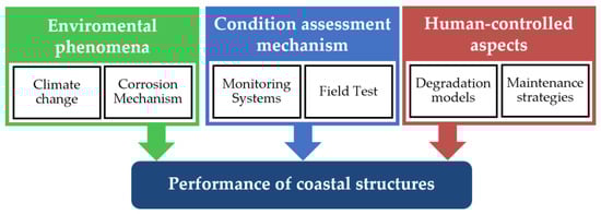 Coastal infrastructure assets play an important role in modern society []. Ports are especially vulnerable to several risks and represent a critical and strategic asset for the development of any country as they handle a large part of economic exchanges []. Hence, understanding the deterioration processes affecting these infrastructures is crucial for determining service life and developing effective maintenance solutions. Reinforced concrete (RC) is one of the most used materials in the world for this kind of asset because of the availability of its components and its ease of construction []. Figure 1 shows the main aspects that have an impact on the performance of coastal structures, where climate change and corrosion mechanisms are the main environmental factors; degradation patterns and maintenance strategies are the main human-controlled aspects; and monitoring and testing are the main mechanisms to assess the condition of structures.