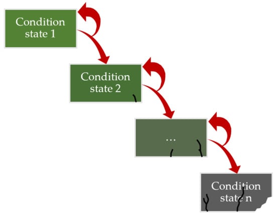 Markov Chain (MC) models stand out in this section because they are based on the discretization of the condition of the structural elements or systems and estimate a probability that the analyzed element deteriorates to the following state in a period []. Figure 8 presents a schematic of the transition of the degradation process of RC structures according to MC models, including the appearance and propagation of cracking and spalling. These probabilities can be established from expert opinions and/or monitoring data available [].