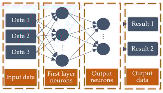 Among these, ANNs have become popular as they overcome the deficiencies of current mechanistic, probabilistic, and statistical models in degradation prediction. The ANN concept is an artificial intelligence method which is originated from the human brain’s understanding []. It consists of each neuron processing information separately and simultaneously, mimicking the brain’s functioning. ANNs obtain knowledge through the training phase, which is established by using a set of training data, where the system identifies the relationship between the input and output parameters. The concept of synaptic weights is determined to store the knowledge from training and to use it to solve problems for an unknown dataset []. Figure 9 presents an example of a neural network.
