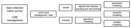 Due to the lack of library objects, Diara et al. (2019) required the development of specific 3D objects using advanced modelling tools (AMTs) based on different types of data, such as historical documentation and georeferenced data [24]. In further research, Banfi et al. (2017) aimed to generate 3D models of existing objects using unique 3D elements with all their specifics without grouping them into simplified architectural databases like libraries and families [58].