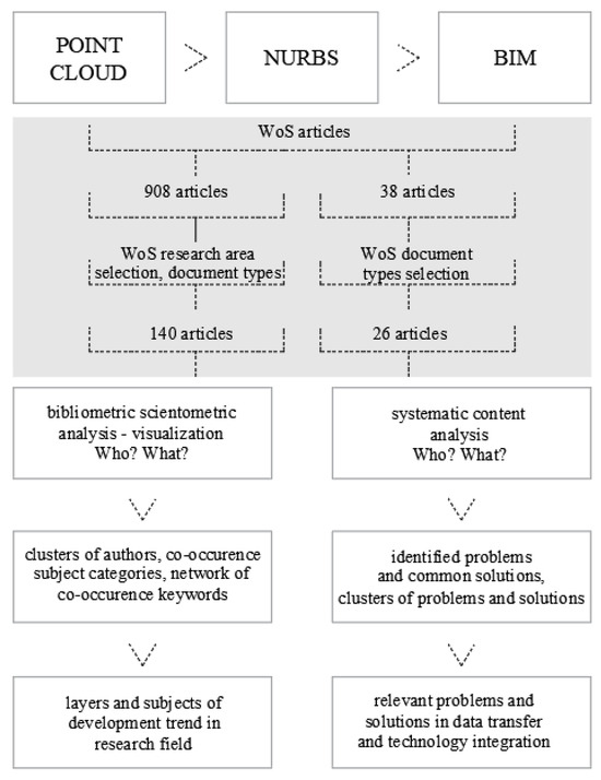 Building Information Modelling (BIM) has found applications not only in the planning and designing of new buildings but also in project monitoring, record-keeping, and analyses of existing structures. In addition to its primary application, information modelling spreads to other areas, developing solutions for their specific uses. This study engaged a mixed-method literature review according to the extent of the pool of knowledge for two research steps between three concepts—from point cloud to NURBS and then from NURBS to BIM. In the first step, the keywords point cloud and NURBS were analysed using scientometric methods. In the second step, a systematic analysis of the content of works obtained with the keywords NURBS and BIM is presented, extracting problems and proposed solutions for information transfer technology. The results of a quantitative analysis identified major trends, (1) research is distributed in interdisciplinary and multidisciplinary areas and historical (heritage) modelling is the highlighted one, (2) development of technologies for object surveying, and (3) the application of data in different engineering fields, while a qualitative analysis points at problems in (1) model building, (2) interoperability, and (3) automatization. Solutions such as mixed models, multi-layered models, a mix of formats, or bridging elements (semantics, proto-model) are proposed.