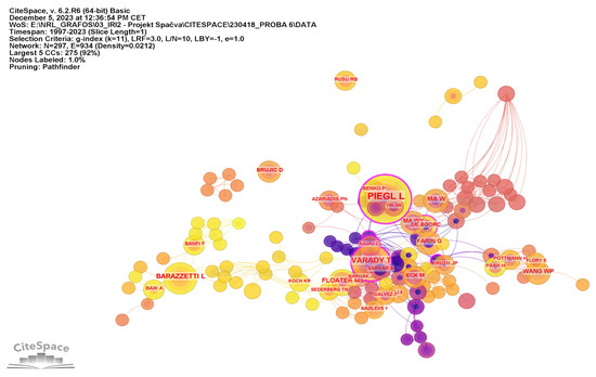 The author analysis not only shows the distribution of highly cited authors and identifies influential scholars in the research field but also helps with understanding the distribution of research topics as well as the value and strength of different subthemes. The software summary highlights major clusters including citing articles and cited references. The importance of nodes is summarised in terms of citation-based metrics, such as citation counts and citation bursts, and network-based metrics, such as degree centrality and betweenness centrality. Sigma is a combination of both types, i.e., burst and betweenness centrality. There are fourteen clustering blocks presented as node clusters in the Figure 3. Cluster #0–Cluster #13 represent thematic scopes of the cooperative groups in different research directions. The largest group is a forty-five-author group with a focus on geometry modelling—natural objects led by Requicha (1999) [27] and followed by Bajaj et al. (1999) and Dimas and Briassoulis (1999) [28,29]. The next cluster gathered twenty-nine authors with a focus on archaeological heritage—wooden ornamentation with leading authors Roma et al. (2014) [30], followed by Munro et al. (2016) and Piegl and Tiller (1999) [31,32]. The same number of authors clustered around CNC machining and the major citing article of the cluster is by Bae and Choi (2002) [33], followed by Vaitkus and Varady (2108) [34]. Twenty-six authors are gathered on reverse engineering with three leading articles’ authors, Sansoni and Docchio (2004), Besl (1990), and Wang et al. (2018) [35,36,37]. Clusters #4–#6 have the same number of authors—twenty-five—as a critical literature review, geometry parametrisation, and heritage place—data-driven conservation action with major citing articles by Barazzetti (2016), Safari et al. (2013), and Bolognesi and Fiorillo (2023) [38,39,40]. The other groups, #7–#13, are working on the rectangular domain, 3D surface, a repair method of a point cloud with a big hole, direct boolean intersection, as-built modelling, nature-inspired optimisation approaches, and improvement in the 3D digitisation process—a reverse engineering process again [37,39,40,41,42,43,44]. Results indicate three main thematic groups authors have gathered around: (1) historical or heritage modelling (archaeological heritage—wooden ornamentation, heritage place, and reverse engineering), (2) technologies and processes dealing with geometry (geometry modelling, geometry parametrisation), and (3) the industry application of technologies (CNC machining, reverse engineering process; see [45,46]). Additionally, there is also a significant number of authors belonging to “a critical literature review” theme, pointing out that the field already reached mature status.