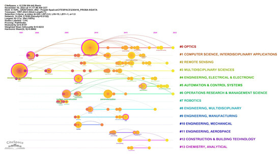 Of the total number of clusters (39), 13 clusters were identified as relevant due to their size (CiteSpace manual, p. 15). The label “#0” in front of the cluster name represents the highest number of represented references within it, indicating its size and significance. The top 10 most relevant clusters are #0 optics (32 articles); #1 computer science, interdisciplinary applications (29 articles); #2 remote sensing (25 articles); #3 mathematics (24 articles); #4 engineering, electrical and electronic (19 articles); #5 automation and control systems (18 articles); #6 operations research and management science (17 articles); #7 robotics (16 articles); #8 engineering, multidisciplinary (14 articles); #9 engineering, manufacturing (13 articles) (Figure 4). Among these ten key areas, only a few are related to applied industries (engineering, electrical and electronic; engineering, manufacturing; remote sensing). At the same time, a more significant proportion of keywords are related to IT (computer science, robotics, automation and control systems, etc.), advancing this field. The review of the co-occurrence map of identified subject categories revealed two main disciplines connected with the point-cloud–NURBS relation, computer science and engineering, but not as independent disciplines but as part of multi- and interdisciplinary fields. The second layer that can be depicted from the results is sub-disciplines such as robotics, remote sensing, automation and control systems, and electronic and electrical engineering.