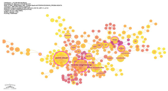 Subject categories are an integral part of every WOS Core Collection database publication. The network of co-occurring subject types in this research that connects the terms “point cloud” and “NURBS” was produced to analyse emerging trends (Figure 4). The analysed network identified 31 clusters of co-occurring cited subject categories. The Modularity Q parameter with a value of 0.8111 suggests a reasonable network division into weakly connected clusters. In contrast, the Weighted Mean Silhouette parameter at 0.9508 indicates high homogeneity of defined clusters.